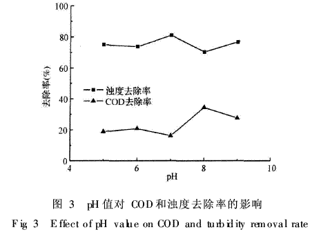 图3表明,此化工废水的COD去除率受pH值影响较大,而浊度去除率受pH值的影响相对较小,这可能是因为pH值影响极性有机物在废水中的存在状态。根据上述趋势,可大致得出最佳操作pH值为8。