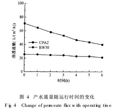 由于预处理去除了废水中大部分的SS,从而使反渗透阶段的脱盐率维持在一个相对较高的值,如BW30膜保持在93%以上,CPA2保持在75%以上。这充分说明,采用絮凝-膜耦合过程深度处理化工废水并回用于生产是比较切实可行的。该方法是一种操作简单、使用方便的新型的深度处理回用技术。
