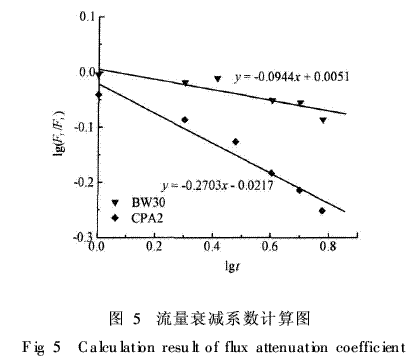 从图4中可看出,2种膜在废水实验中均发生通量下降现象,BW30膜产水通量在运行时间内下降趋势不明显,而CPA2膜在运行时间内通量下降趋势明显,但总体上而言,CPA2膜要比BW30膜产水通量大。通常,膜在一定压力下被压密,会导致水通量逐渐减小,可用流量衰减系数(压密斜率m=lg(Ft/Fi)/lgt)表征,m值越小说明膜性能越好,计算结果如图5所示。图5中的压密斜率表明,本实验中CPA2膜的流量衰减系数比BW30膜要大,这与图4结果基本一致。BW30膜通量在运行期内变化趋势稳定,而CPA2膜在初始高通量段变化较大,在其后期低通量段也逐渐趋于稳定。