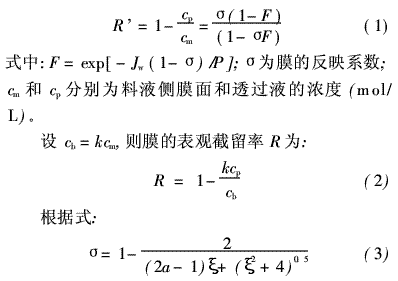 由非平衡热力学的Spiegler-Kedem方程,可得膜的真实截留率R'为: