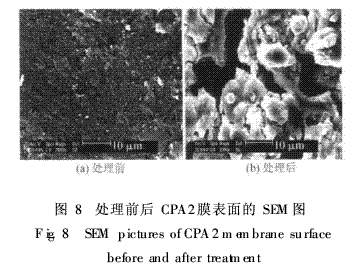 实验结束后,以通量衰减程度较大的CPA2膜为例,将处理前的膜片与膜槽中连续试验的膜片一起采用SEM表征,并比较污染前后的膜面形态变化,结果如图8所示。污染前后膜面变化非常明显,初始CPA2膜膜面相对比较光滑,处理料液后膜的表面架构(而非吸附)了很多形状不规则的、厚度分布不均匀的絮状物质,通过简单的酸碱化学清洗以及水力冲刷,这些块状物几乎可以全部去除。这表明,采用耦合过程后,废水中的有机胶体物质由于絮凝抱团现象,松散地堆积在膜的表面上方,而非渗入膜内部通道,从而减少了进入膜主体的污染,有利于今后进一步的规模化工程应用。