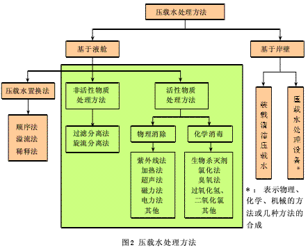 非活性物理处理方法主要是固液分离,其原理是将固体悬浮颗粒物包括大型悬浮微生物从压载水中分离出来,可以使用沉降法(利用颗粒物的自重)或表面过滤(使滤器的孔径小于颗粒物或微生物的尺寸),但沉降法要求时间较长,因此不适用于船上应用。灭活压载水水生物和微生物技术是通过物理清除或化学消毒两方面,达到杀死压载水中病菌和微小生物体的目的。但物理消除和化学消毒过程都需要先通过固-液分离过程来降低物理化学处理的难度,同时需要对压载水进行消毒并去除残余物。物理清除主要有紫外线法、加热法、超声波、磁力法及电子脉冲等。化学消毒主要有氯化法、臭氧法、二氧化氯法、双氧水法等。上述压载水处理方法都不能完全满足船舶压载水处理的要求,而通过联合的技术至少部分有效、经济且适用于船舶,基本上是基于机械清除某些有机物后加以物理或化学的处理。目前国内外开发商纷纷以这点为突破口进行压载水处理系统的开发。