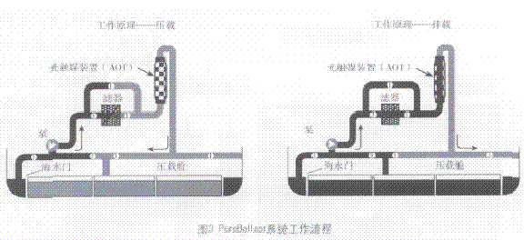 PureBallast系统的主要设备有滤器、WalleniusAOT单元、CIP单元和流量计。其工作原理是基于优先氧化还原技术,利用灯发出的光源照射到催化板上,产生活性极强的HO-,HO-去寻找有机物中的H+,两者结合成水分子,以此来破坏细胞膜达到杀死细菌的目的。工作过程为:压载水首先经过一个过滤器,去掉水中大于50μm的有机体,这样有助于减少压载水舱中沉淀物的数量。然后水再进入一个消毒器,通过消毒器产生的活性物质来分解通过滤器的有机体,得到符合标准的水,最后水进入压载舱。排压载水时,水不需再通过滤器,只要通过消毒器后即可直接排舷外。系统还配备一套自动清洗装置,该装置在消毒器每次处理完压载水后对之进行反冲洗,以免长期使用形成的水垢影响设备的性能。整个过程无须任何准备工作或化学试剂的投放,完全自动化,操控员可以监控警报并执行本地或遥控操作,一个按钮即可控制系统的启动和停止,过滤器和光触媒装置(AOT)均备有自动清洗设备,光触媒装置的洗涤剂也不会对环境产生破坏。PureBallast系统工作流程如图3所示。