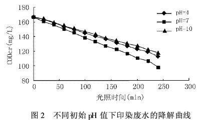 从图2中可以看出,印染废水的起始pH值为7时,降解液CODcr下降快。从对实际印染废水做的平行实验结果看,初始pH值为原水pH值6.6时,光降解效果最佳。碱性条件则不利于有机物的去除,其原因为:①TiO2在不同pH值的溶液中其ξ电势不同,据文献报道〔5〕,低pH值时的电势为正(有利于带负电荷的有机基团的吸附)。而在碱性条件下TiO2的ξ电势为负(不利于阴离子基团的吸附)。对于印染废水来说,许多染料溶于水后都呈带色的阴离子基团,因此适合在酸性条件下用TiO2光催化氧化法进行处理。