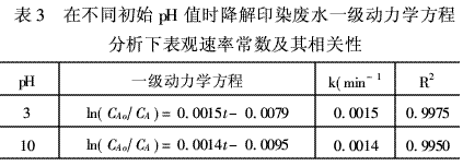 由表3可知,pH值=3或10时,用一级反应动力学方程拟合,相关度R2很好。则不同pH值=3或10的印染废水的降解过程遵循一级反应动力学规律,而pH值等于7时,降解过程遵循零级反应动力学规律。拟合结果表明,不同的pH值对光降解反应的反应级数有影响。