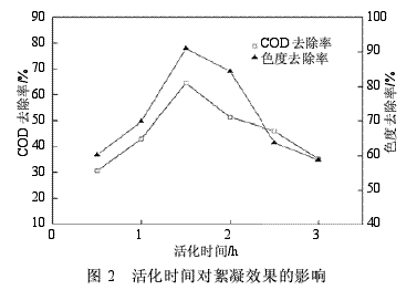 由于硅酸溶液具有强烈的缩聚趋势,随着聚合反应的进行,分子量不断加大,最终转化成为高分子硅酸凝胶,失去其絮凝活性,因此必须在硅酸的有效稳定期内加入金属离子以阻止其缩聚。所以控制加入金属离子的时间即硅酸的活化时间,会直接影响聚硅酸硫酸锌镁的絮凝性能。活化时间对絮凝效果的影响结果如图2所示。由图2可知,随着活化时间的增加,絮凝效果先增大然后变小,在活化时间为1.5h时,COD和色度去除率达到最佳值。这与文献所述的聚硅酸最佳活化时间为40~150min一致。本实验制备聚硅酸锌镁的活化时间选为1.5h。
