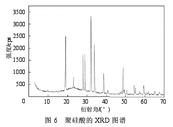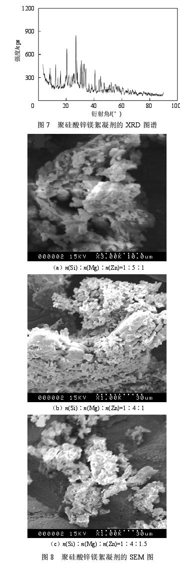 图6是聚硅酸的XRD图谱,图7为聚硅酸锌镁絮凝剂的XRD图谱。由图6可以看出,聚硅酸在2θ为15°~35°间出现了较大的几个峰包,这属于无定形结构的非晶态物质产生的衍射峰,说明聚硅酸中无晶相生成。比较图6和图7可知,聚硅酸锌镁的XRD图谱比聚硅酸XRD图谱的峰强度减弱,峰宽加大,而且在2θ=15°~35°间由聚硅酸产生的非晶包增强,出现代表多晶相共存的多个小衍射峰,说明Mg2+、Zn2+、SO42-均已参加了反应,并与硅酸的链状、环状大分子端基氢氧根之间络合,即形成了共聚物。可判断出它们的共聚物均为无定形结构,推测属大分子长程无序物相。