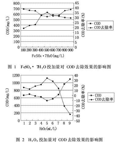 H2O2和FeSO4.7H2O作为反应物,其投加量直接关系到.OH的生成和预处理的成本,因而是研究的重点,且反应物的量一变,所需要的反应时间等因素都相应变化,所以首先确定二者投加量。另外H2O2和FeSO4.7H2O投加量互相牵制,即存在一个最佳投加比,所以将二者绑定。首先根据经验值固定H2O2投加量,设置一系列FeSO4.7H2O投加量,根据COD去除率筛选最佳FeSO4.7H2O投加量;然后反过来固定FeSO4.7H2O投加量再设置一系列H2O2投加量,直至确定二者的最佳组合。
