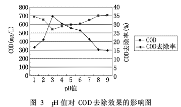 如图3所示固定FeSO4.7H2O和H2O2投加量后,COD去除率随系列pH值的变化图。可以明显看出pH值在2~7时,处理效果都比较接近,在pH为3时处理效果最好,COD去除率达到34.7%。