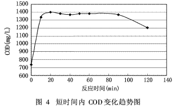 许多研究指出Fenton反应的一大特点就是反应速度快,好多实验都将时间定在60min以内,但本实验结果发现COD值在2h内一直没有低于原水,见图4,反而出现了大幅度升高,最大值出现在反应后20min,COD达1397.6mg/L,比原水高出89.1%。