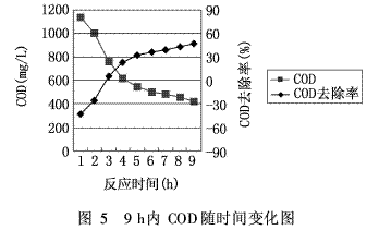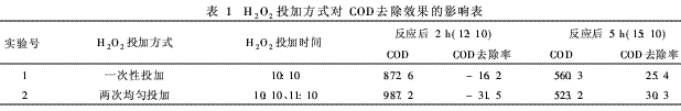 从表1可以看出,反应后2h和5h的处理效果对比情况不尽相同。在反应后2h两个实验装置中COD都是升高的,其中分两次投加的比一次投加的还要高;在反应后5h,两个装置中COD都得到降解,分两次投加的一组处理效果更好。