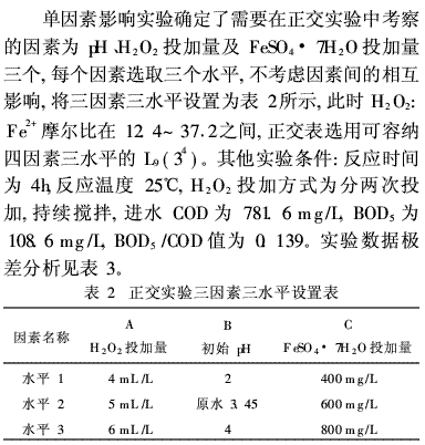 4.1 通过单因素影响实验和正交实验,以COD去除率和可生化性能两个指标为筛选依据,综合成本和处理效果等因素,确定出最佳参数组合为:H2O2投加量为5mL/L,FeSO4.7H2O投加量为800mg/L,pH值为3.45,此时H2O2:Fe2+摩尔比为15.5,COD去除率为33.4%,BOD/COD值从0.139增加到0.321。