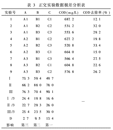 从表3可以看出,5号实验处理效果最好,COD去除率达33.4%。本次实验中DC>DB>DA,也就是说在本次实验考察的范围内,FeSO4.7H2O投加量对处理效果的影响最大,pH值次之,H2O2投加量排最后。测定BOD5后发现可生化性能提高最多的是5号实验,BOD5/COD值从0.139增长到0.321。综合成本和处理效果等因素,确定了本实验最佳组合为:H2O2投加量为5mL/L,FeSO4.7H2O投加量为800mg/L,pH值为3.45,此时H2O2:Fe2+摩尔比为15.5,COD去除率为33.4%,BOD/COD值从0.139增加到0.321。