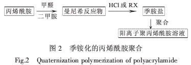 用一定浓度的丙烯酰胺水溶液,搅拌加热一定时间,调整pH值,用Cl2保护进行羟甲基化。然后进行烷胺基化。反应终止后,冷却至室温,使之季胺化。产物提纯后,水溶液聚合得季铵化的阳离子聚丙烯酰胺。该工艺流程见图2。