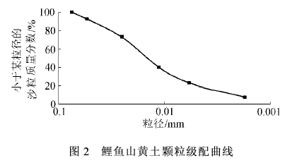 ÊÔÑéÑ¡ÓÃн®ÎÚ³ľÆëÀðÓãɽµÄÌìÈ»»ÆÍÁ×÷ΪģÐÍɳ¡£ÀðÓãɽ»ÆÍÁµÄ¿ÅÁ£¼¶Åä¼ûͼ2¡£ÓÉͼ2¿É¼û£¬ÀðÓãɽµÄ»ÆÍÁ¿ÅÁ£Á£¾¶´óÓÚ0.007mmµÄɳÁ£ÖÊÁ¿·ÖÊýΪ79.61%£¬Á£¾¶´óÓÚ0.250mmµÄɳÁ£ÖÊÁ¿·ÖÊýΪ0.16%£¬ÖÐÖµÁ£¾¶Îª0.019mm¡£