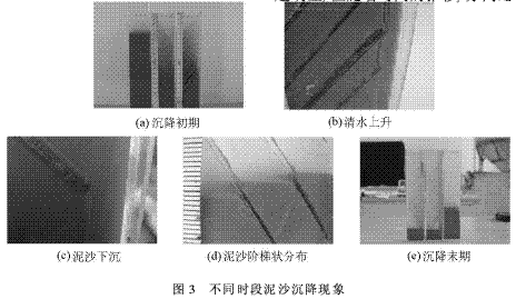 ÊÔÑéÖй۲쵽6×éÊÔÑùµÄÄàɳ³Á½µÏÖÏó»ù±¾Ïàͬ£¬¶¼ÊÇÎÞÈúƬÆÕͨ¹ÜÖÐÄàɳ´ÓϳÁÒÁʼ¾Í²úÉúÁËÃ÷ÏÔµÄÇå»ëË®½»½çÃæ£¬Äàɳ»ºÂýϳÁ£»¶øµ¥ÅÅÈúƬ·ÖÀëÈú¹ÜºÍË«ÅÅÈúƬ·ÖÀëÈú¹ÜûÓвúÉúÃ÷ÏÔµÄÇå»ëË®½»½çÃæ£¬ÉϲãË®ÌåÖð½¥ÓÉ»ëתµ£¬Èçͼ3(a)Ëùʾ(´Ó×óÖÁÓÒÒÀ´ÎΪÎÞÈúƬÆÕͨ¹Ü¡¢µ¥ÅÅÈúƬ·ÖÀëÈú¹Ü¡¢Ë«ÅÅÈúƬ·ÖÀëÈú¹Ü)¡£Äàɳ³Á½µµ½ÈúƬÉϺóÑØÈúƬÏòÏ»¬¶¯£¬ÖÁÈúƬµÍ¶Ë³Ê¿ÅÁ£×´»òÕßÍÅ×´µÄÄàɳ¾Û¼¯³ÉÀàËÆÄཬÁ÷´ÓÈúƬµÍ¶Ë´¹Ö±ÏòÏÂÁ÷¶¯£¬¶øÇåË®Ôò´ÓÈúƬµÄϱíÃæÇãбÏòÉÏÔ˶¯ÖÁ¸ß¶ËÒ»²à»ã¼¯³ÉÇåË®Á÷ÉÏÉý£¬Èçͼ3(b)(c)Ëùʾ¡£Äàɳ³Á½µµ½·ÖÀëÈúµ×²¿ºó£¬ÄÜÃ÷ÏԵؿ´µ½¸÷ÈúƬ¼äϳÁµÄÄàɳ³Ê½×ÌÝ×´·Ö²¼(Èçͼ3(d)Ëùʾ)£¬ÇÒº¬É³Å¨¶ÈÔ½¸ß£¬´ËÏÖÏóÔ½Ã÷ÏÔ£¬µ«Ëæ×Åʱ¼äµÄÍÆÒÆ£¬·ÖÀëÈúÖи÷ÈúƬ¼äµÄ»ëÒºÃæ×îÖÕÇ÷ÓÚÍ¬Ò»Ë®Æ½ÃæÉÏ£¬Èçͼ3(e)Ëùʾ(´Ó×óµ½ÓÒÒÀ´ÎΪ˫ÅÅÈúƬ·ÖÀëÈú¡¢µ¥ÅÅÈúƬ·ÖÀëÈú¡¢ÎÞÈúƬÆÕͨ¹Ü)¡£