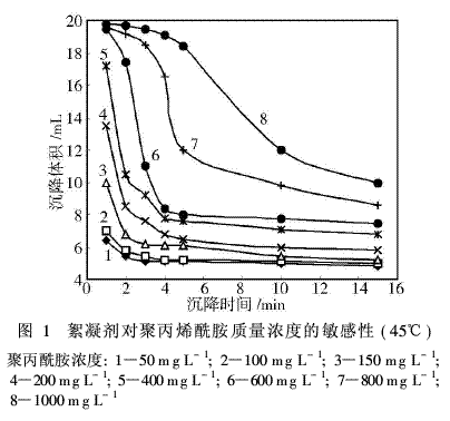 1.3 絮凝剂对聚合物浓度的敏感性用污水将1200mg/L的聚合物母液分别稀释至不同浓度,将这些稀释液分别与3%YG866絮凝剂水分散体按体积比4∶1均匀混合,放入20毫升具塞刻度试管中,在45℃下混合体系的沉降体积随时间的变化见图1。从图1可以看出,絮凝剂对50~1000mg/L聚丙烯酰胺溶液都敏感。为了利用地层中的聚合物进行调剖,聚合物浓度应满足两个条件,即絮凝速度快和形成的絮凝体体积大(即沉降体积大)。满足上述两个条件的聚丙烯酰胺浓度在200~600mg/L范围。