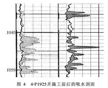 按照注聚压力低、对应油井产聚浓度高、注聚过程对应油井增产油量少、距注聚结束时间短、井网完善和井况良好等原则选择注絮凝剂试验井。2007年8月在喇嘛甸油田4-P1920井区进行聚合物驱后注絮凝剂水分散体矿场扩大试验。该井区包括5-P1905井、5-P2000井、5-P1925井、4-P1920井、5-P1920井、4-P1925井6口注入井,干线压力15MPa,注入压力10.9~12.8MPa。施工时,试验井注入3%絮凝分散体平均5160m3,絮凝剂平均用量为140t。施工后,试验井的吸水剖面有明显的改善(见图4)。