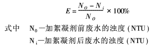 将生活废水搅拌混匀,取200mL水样于烧杯中,调pH值,加入一定量的絮凝剂,以200rad.min-1速度快速搅拌1min,然后以80rad.min-1慢速搅拌3min,停止搅拌,静置沉降15min,在液面下2~3cm处取适量上层水样测其浊度。去浊率(E)的计算公式如下:
