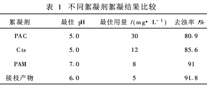 表1列出了四种絮凝剂处理生活废水达到最佳絮凝效果的用量。接枝产物处理生活废水的用量少,且去浊率高。生活废水的特点是含有大量的有机质,固体颗粒度细微,有大量负电荷,而接枝共聚物有分子量大和阳离子度高的特点,在絮凝过程中发挥吸附架桥和电性中和的双重作用,用量少,絮凝效果最佳。故接枝共聚物是处理生活废水的一种良好的絮凝剂,其絮凝效果优于PAC、CTS、PAM。