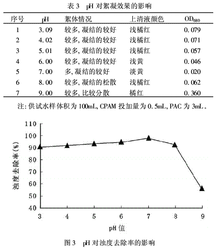 从表3可知,在弱酸性至弱碱性条件下,CPAM与PAC复配使用均有较好的脱色和除浊效果,且pH在3.0—8.0时的浊度去除率均大于90%(图3)。但当水样pH值愈接近中性处理效果愈好;当水样pH为7.0时絮体最多、上清液颜色最浅,浊度去除率达97.56%(图3)。因此,以CPAM和PAC复配处理该废水时具有较宽的pH值使用范围,最佳pH值为7.0。
