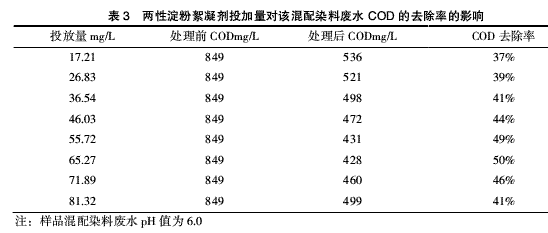本试验研究了两性淀粉絮凝剂投加量对其去除样品混配染料废水COD性能的影响,结果见表3。
