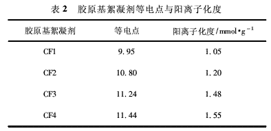 实验在CHPTAC用量为1.25、2.50、5.00、7.50mmol/g下分别制得了胶原基絮凝剂CF1、CF2、CF3、CF4。在制备CF过程中,CF1、CF2和CF3的阳离子化度随阳离子化试剂CHPTAC用量的增加逐渐增大,继续增加CHPTAC的用量,CF4的阳离子化度增加不大,这可能是因为胶原蛋白在反应过程中与CHPTAC结合的氨基有限造成的。相应地CF1、CF2、CF3和CF4的等电点依次增加(见表2)。