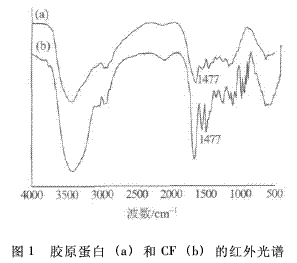胶原蛋白和CF的红外光谱如图1所示。由图1可以看出,胶原蛋白在CHPTAC接枝前后的红外光谱基本相同。典型的差别是CF的谱图中在1477cm-1处出现了—CH3的C—H弯曲振动强吸收峰,说明CF引入了羟丙基三甲基氯化铵的季铵盐侧链。