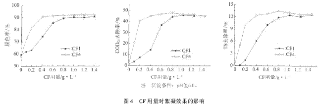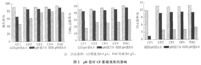 废水沉淀处理中,通常絮凝剂浓度愈高,絮凝效果愈明显,但当絮凝剂超过一定浓度后其作用效率就会降低。如图4所示,在pH值为6的条件下,随CF用量增加废水脱色率、CODCr和TS去除率逐渐增大,当CF4和CF1用量分别达0.4g/L和0.8g/L后废水脱色率趋于稳定,而在CF4用量为0.8g/L时,废水CODCr和TS去除率趋于稳定,分别达47.8%和13.4%。随CF用量进一步增大,废水的脱色率、CODCr和TS去除率没有明显变化,这主要是由于CF加入过量时,使木质素和半纤维素等污染物表面重新带有正电荷。此时电中和完全,CF大分子链的空位吸附呈电中性的污染物颗粒,而CF链带有正电荷,从而使污染物呈正电性质,重新分散。同时,由于高浓度絮凝剂所造成的空间位阻使得污染物互相隔离,又重新处于稳定分散状态。