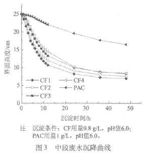 废水沉淀实验在250mL具塞量筒中进行。废水调至设定pH值后转移至量筒中。用少量水分散CF、PAC、硅藻土和CPAM,加入量筒中,使PAC、硅藻土和CPAM的浓度分别为1g/L、1g/L和40mg/L,上下倒置震荡具塞量筒1min,静置24h,取上清液进行CODCr、TS和脱色率的分析。同时以未经处理过的中段废水进行对照分析。沉淀过程中记录泥水界面,绘制沉降曲线。