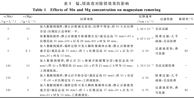 1)絮凝沉淀的效果与溶液中锰浓度关系不大,与镁浓度有密切关系,只有当溶液中c(Mg)≤3g/L时,絮凝沉降速率快,便于进行过滤及洗涤。