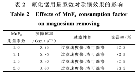 试验条件:c(Mn)=160g/L,c(Mg)=3g/L,反应温度90℃,反应时间60min,非离子型PAM絮凝剂用量为每克镁0.01g,絮凝温度35℃。氟化锰用量系数对除镁效果的影响如表2所示。