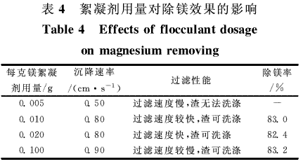 表4表明:絮凝剂用量少时,MgF2絮凝沉淀不完全,导致溶液无法过滤,而用量过高时虽然絮凝效果好,但过多的絮凝剂使溶液成胶状,反而影响其过滤性能,综合考虑后认为每克镁絮凝剂用量0.01~0.02g较佳。