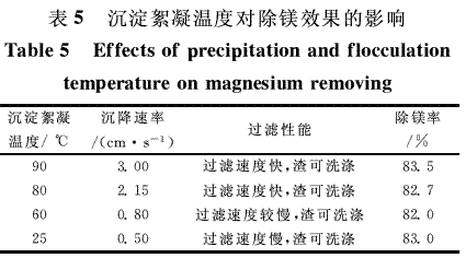 4)沉淀、絮凝温度对除镁率影响不大,当沉降温度从25℃升高到90℃时,除镁率均为83%左右,当温度高于80℃后,过滤速度明显加快。絮凝沉降过程受温度影响较大,当沉降温度从25℃升高到90℃时,沉降速度从0.5cm/s增加到3cm/s,适宜的沉淀、絮凝温度为80℃。