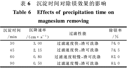 5)随反应时间延长,沉降速度降低,过滤性能变差,除镁率增加,比较适宜的沉淀时间为60min。