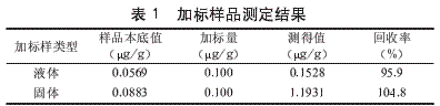 分别在液体和固体的氯化铁样品中加入一定量的砷标准物,按上述步骤处理后测定,结果见表1。
