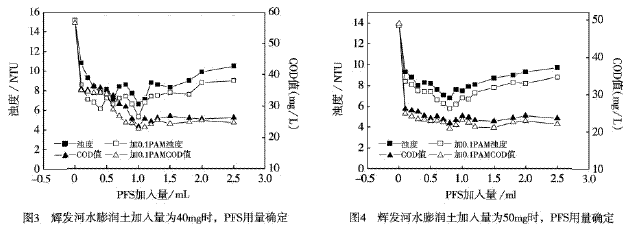 由图3可知,膨润土加入量为40mg,PFS用量为1.0mL时,处理后水浊度为6.6NTU,COD值为23.4mg/L,这时能明显看到去除效果。同时加0.1mLPAM时,浊度为5.3NTU,COD值为22.8mg/L。在有PAM助凝剂时,浊度和COD值都有明显变化,说明此水质在处理时不但需要PFS还需要PAM同时进行混凝试验。