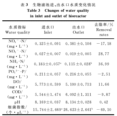 由表3可见,开启生物过滤池能有效去除水体中的NH3-N和NO2--N的去除率分别为36.99%和28.77%;系统在降低NH3-N和NO2--N的同时,会消耗水体中的DO,使DO浓度降低11.66%;开启该系统能提高水体中NO3--N、COD和细菌指数,NO3--N、COD和细菌指数分别上升了17.18%、9.87%和69.10%;pH值和PO43--P变化很小。该系统对NH3-N的去除作用和增加细菌的数量作用达显著水平。