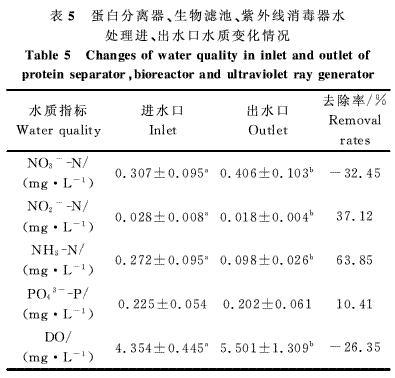 由表5可见,养殖水体经蛋白质分离器、生物滤池和紫外线消毒器一系列处理后能显著去除NO2--N和NH3-N,对NO2--N和NH3-N的去除率分别为37.12%和63.85%;并且使COD和细菌指数显著降低,分别降低了36.01%和84.29%;使PO43--P的浓度降低了10.41%,但未达显著水平。该系统能显著提高水体NO3--N和DO浓度,NO3--N和DO浓度分别上升了32.45%和26.35%;使pH值略有升高,升高了0.25%。