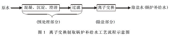 目前传统的锅炉补给水制取的工艺主要是利用离子交换技术。离子交换除盐水处理技术的使用已经非常成熟,其基本工艺流程如图1所示。