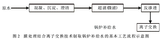 膜处理结合离子交换技术制取锅炉补给水的基本工艺流程如图2所示。