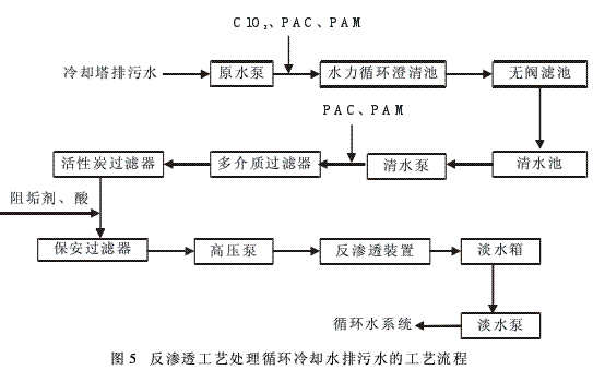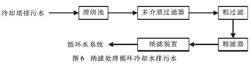 采用纳滤技术也可以有效的去除循环冷却排污水中的含盐量和总硬度。纳滤需要的工作压力比反渗透低。其处理循环冷却排污水的工艺流程如图6所示。