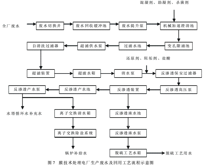 为了节能减排,更好地利用水资源,某电厂在其原有的废水水处理系统上进行改造,增加超滤和反渗透膜处理系统,使得原来的废水经处理后回用作为生产用水,大大提高了水资源的利用率。其废水处理及回用水处理流程如图7所示。