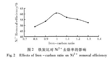 从图2可以看出,在铁炭比在1∶1时,处理效果最好,Ni的去除率为60.83%。当铁炭比较小时,以微电解反应和炭的吸附作用为主;当铁炭比较大时,以微电解反应和铁的置换作用为主,从图2的变化趋势可以看出,微电解反应比单纯的吸附和置换作用,对Ni2+的去除作用更强。