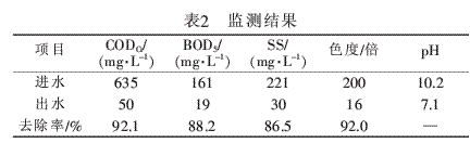 从表2数据可以看出,该处理系统对废水的CODCr、BOD5、SS及色度的去除率分别达到92.1%、88.2%、86.5%、92.0%,出水CODCr、BOD5和SS的质量浓度分别为50、19、30mg/L,色度为16,pH为7.1,各项指标均达到了《纺织工业水污染排放标准》(GB4287—1992)中的一级排放标准要求。