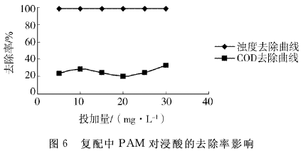 由图6可知:增加PAM的投加量在一定程度上有利于浊度的去除,它改善了絮凝反应环境,促进絮凝剂PAC与浸酸中胶体颗粒的反应,使得CODcr去除率提高,也提高了沉降速度,改变沉降性能。当PAM投加量在10mg/L左右时,COD cr的去除率达到最大,随之开始下降,PAM过多CODcr值反而增加了。