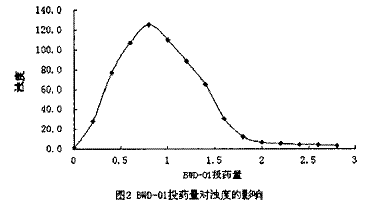絮凝剂BWD—01最佳投药量的测定的实验结果:整理实验过程1的数据,其结果见图1。