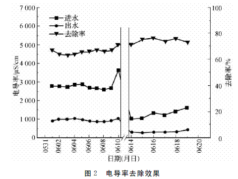 如图2所示,6月9日以前进水电导比较稳定,6月10日酸洗管道,重新补水,原水变化较大;平均进水电导率为2 243.5μS/cm,出水为716.5μS/cm,去除率为68.1%,出水可以达到要求的1 000μS/cm,且去除率相对较稳定;从整体来看,在进水电导率变化较大的情况下,出水电导率并没有出现异常,模块的抗冲击能力较好。