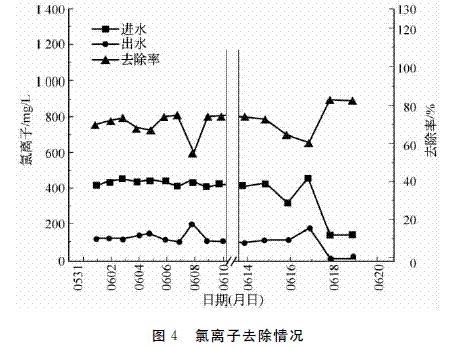 (2)原水氯离子平均为396.1mg/L,产水平均为118.3mg/L,平均去除率可达71.2%。