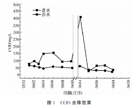 4.4 COD由图5可知,电吸附技术对该原水中的COD也有一定的去除效果。在原水COD为112.3mg/L的情况下,电吸附产水COD平均为46.3mg/L,去除率为58.8%。